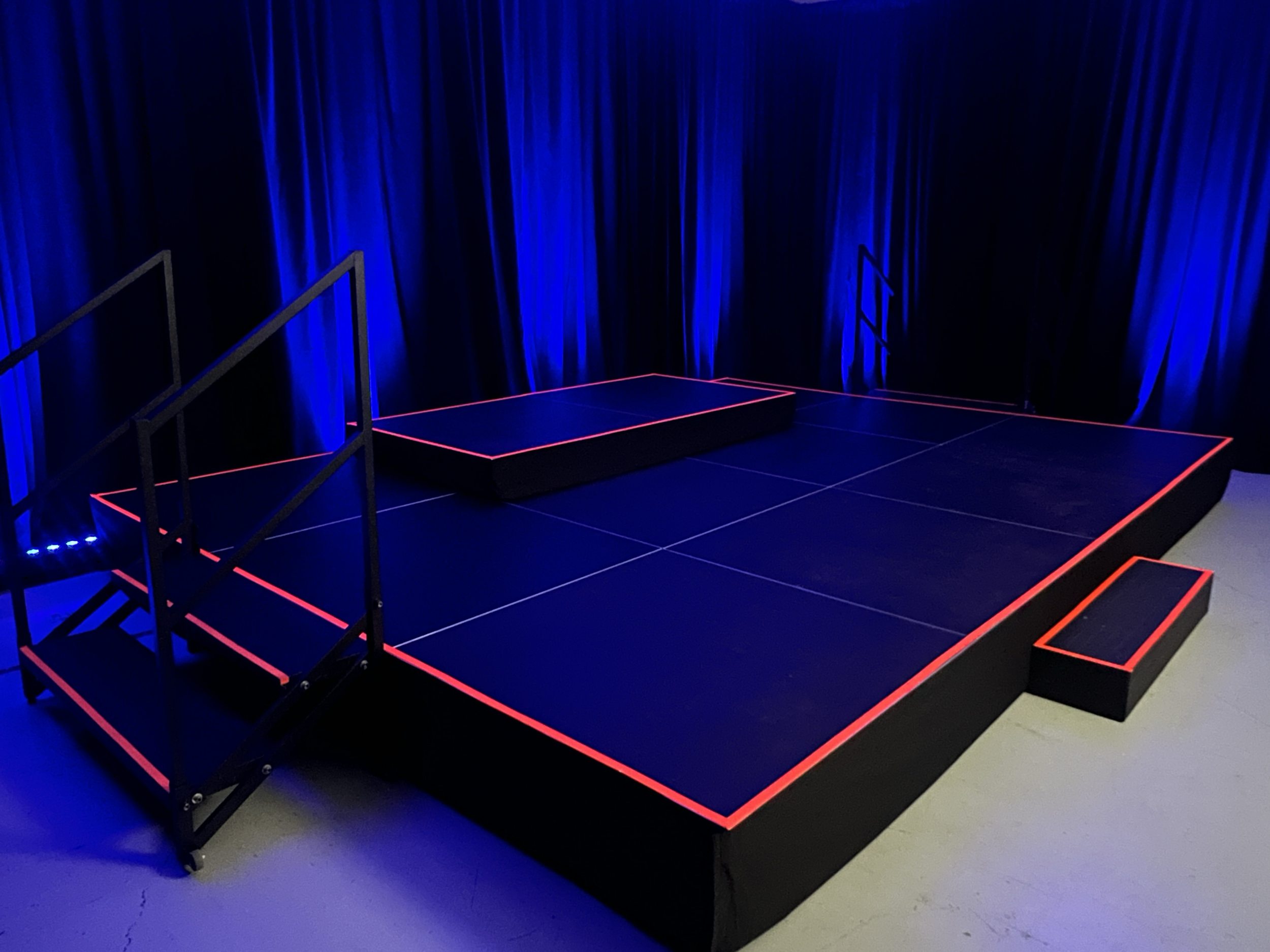 Choose between our modern black or white flat stage skirting - a clean, pleat-free look perfect for corporate, wedding, or fashion productions. Our stages can be configured in custom shapes and sizes, including catwalks (runways) for fashion shows and performances.